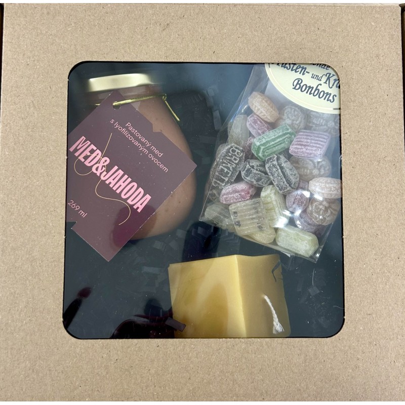 Dárkový balíček - Med s jahodou, prémiová svíčka z pravého včelího vosku a bonbony