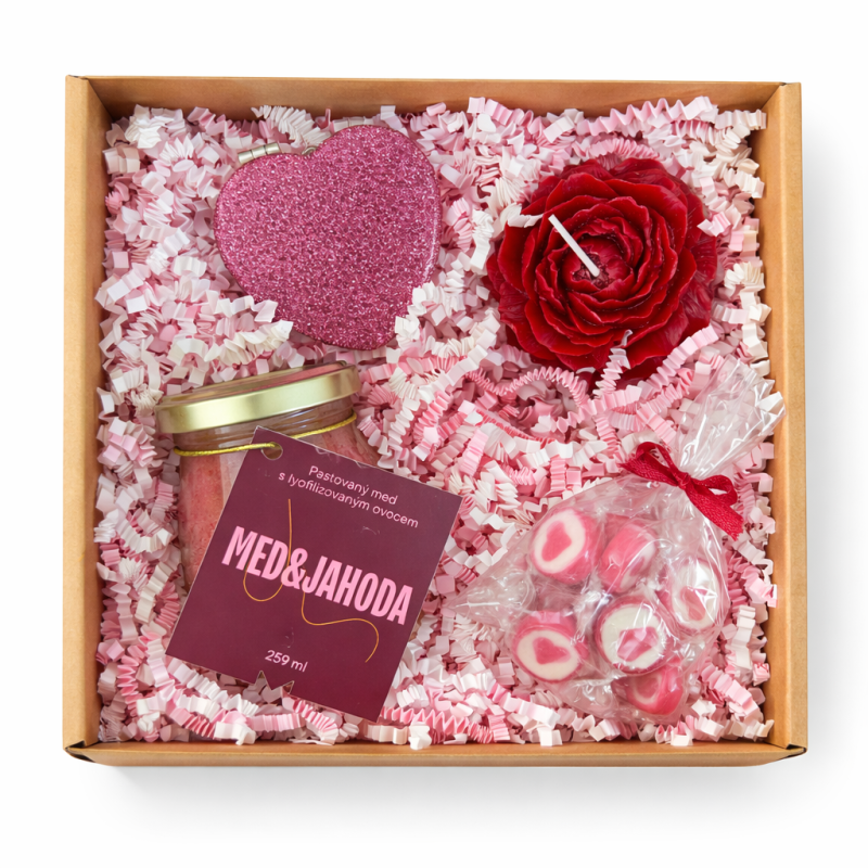 💕 Valentýnský balíček - Med & jahoda, bonbony, zrcadlo a červená vonná svíčka ve tvaru pivoňky