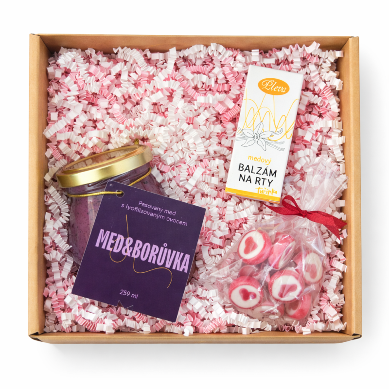 💕 Dárkový balíček pro ni – med s borůvkou, balzám na rty a medové bonbony