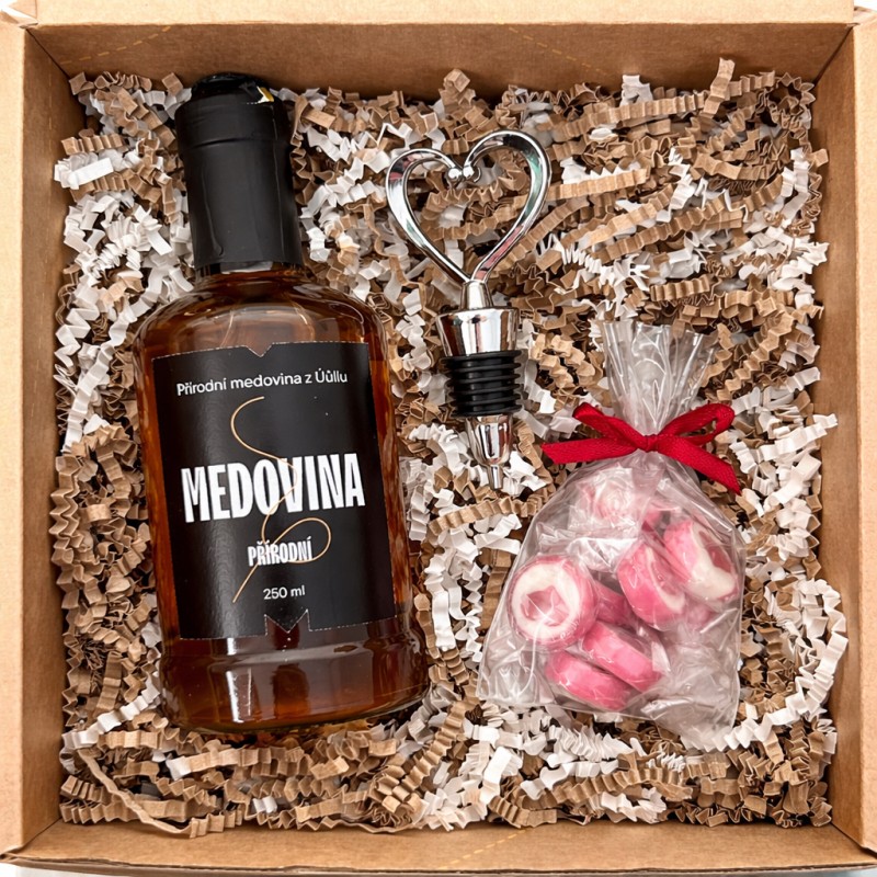 💙 Valentýnský balíček - Přírodní medovina, zátka ve tvaru srdce a bonbony