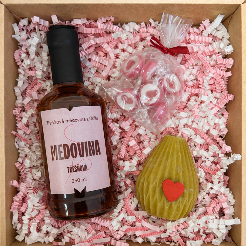 💕 Valentýnský balíček – Třešňová medovina, svíčka z pravého včelího vosku a bonbony