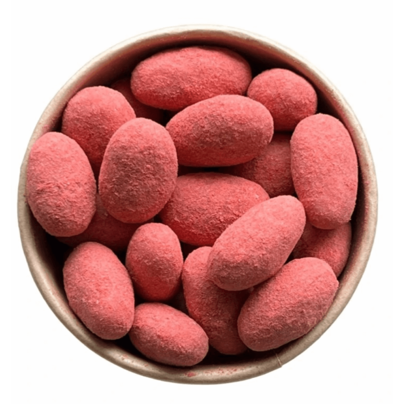 Nezaměnitelná chuť. Kombinace mandle v bílé čokoládě obalená v jahodovém prášku. Už nepotřebujete nic víc.
