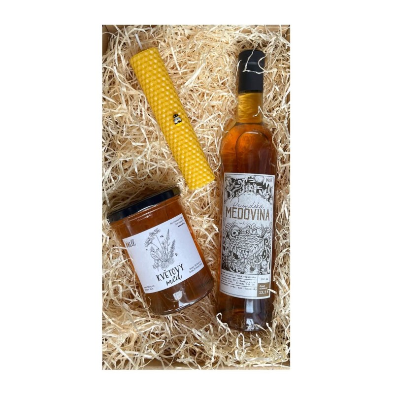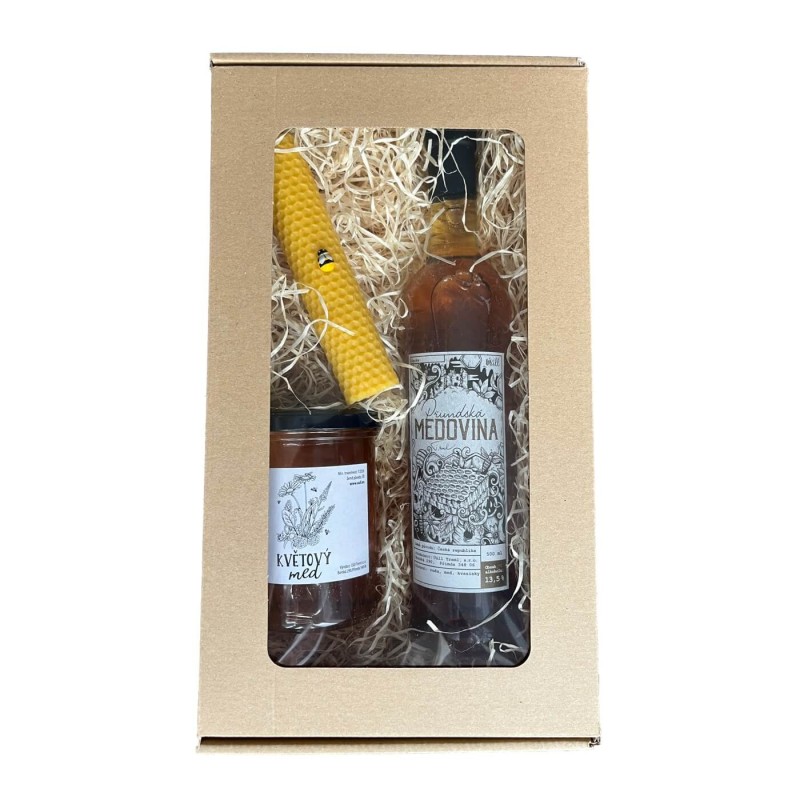 Dárkový balíček s medovinou, medem s motanou svíčkou.